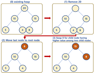 - root 노드의 값이 child node 보다 작을 경우 root 노드의 child node 중 가장 큰 값을 가진 노드와 root 노드 위치를 바꿔주는 작업을 반복 (swap)