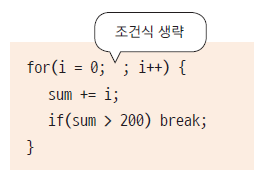 - 초기화식 생략 : 이미 이전에 값이 초기화 되어 for 내부에서 값을 지정할 필요가 없는 경우