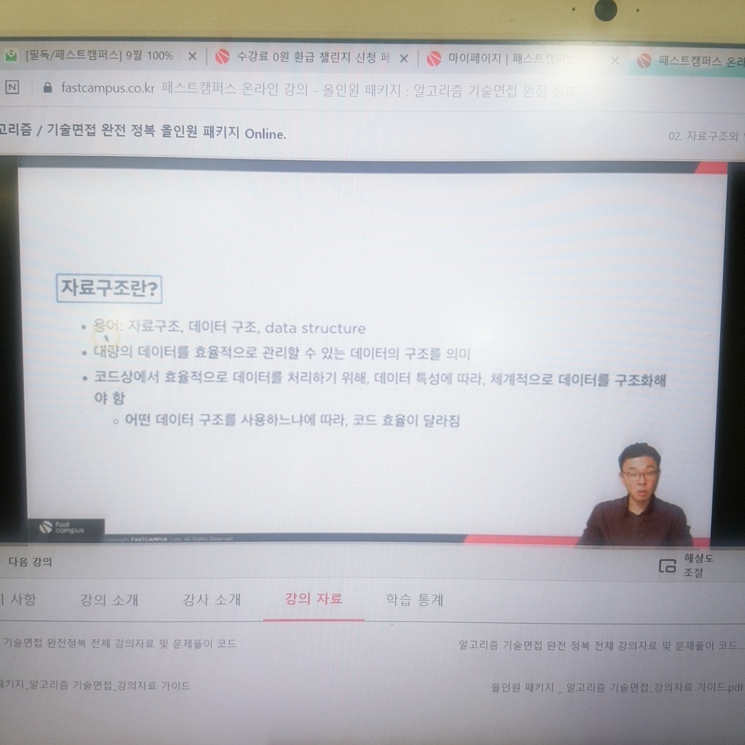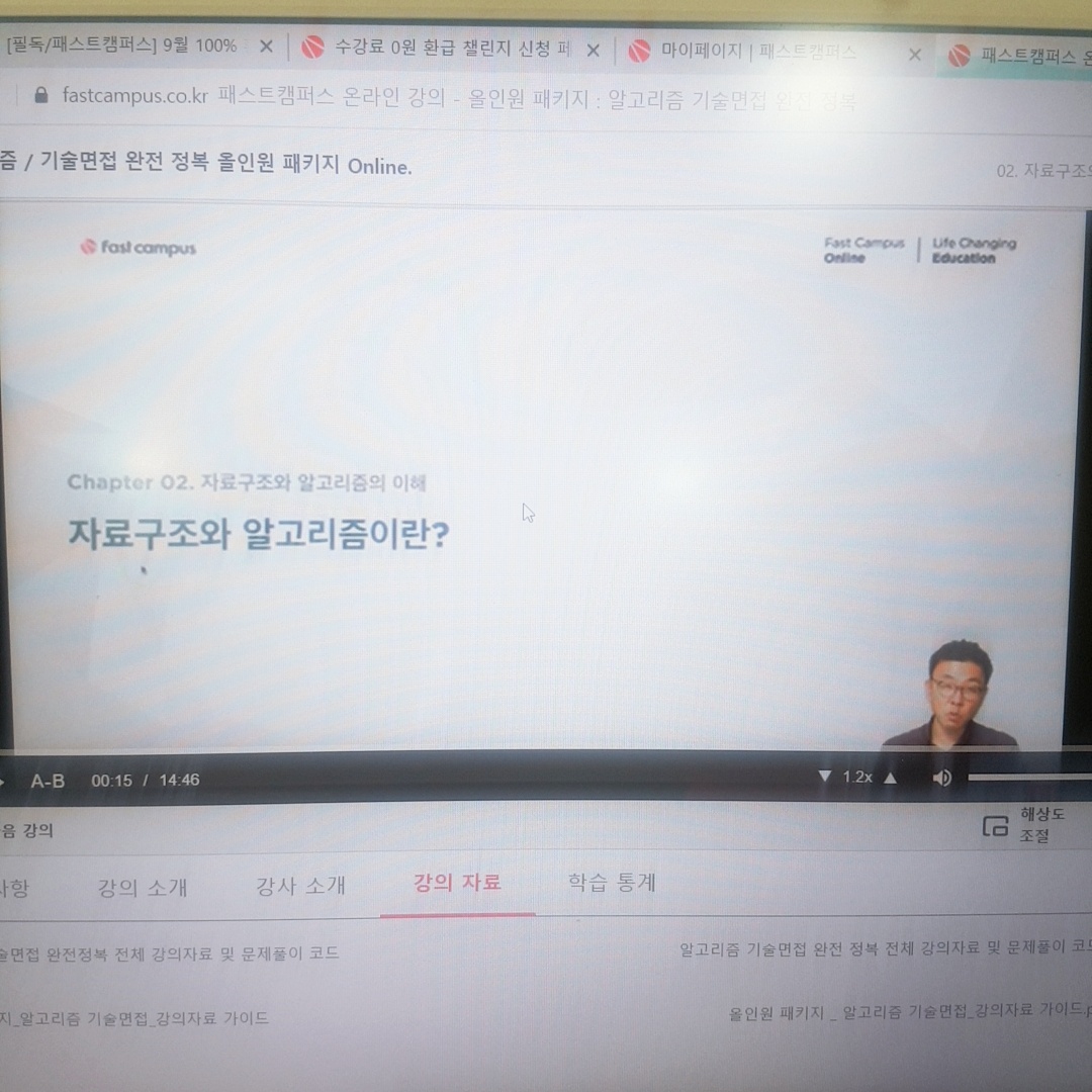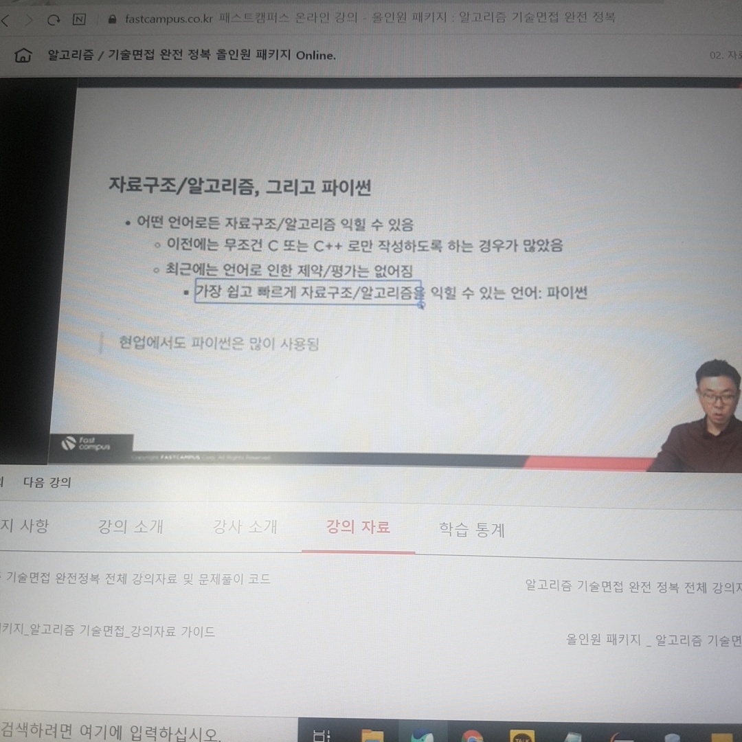 패스트 캠퍼스에서 강의하는 알고리즘/ 기술면접 완전 정복 올인원 패키지 online 강의를 수강하게 되었습니다. 코딩테스트 준비도 해준다고 하니까 빨리 모든 강의를 수강완료해 실력이 향상되는 저를 보고 싶네요 ㅎㅎ